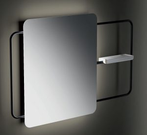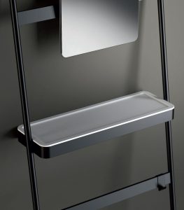 - Materiali: tubo Ø 16 mm in acciaio inox o alluminio verniciato; mensola in vetro temperato; specchio con bordo differenziato