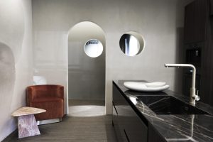 Ciascuno spazio possiede un’identità definita, mentre a guidare l’intera narrazione è un linguaggio limpido, radicato nella profonda ammirazione di Mariacristina Giobbi per la tradizione di Gio Ponti. Fonte primaria di ispirazione è stato, infatti, un numero della rivista Domus del 1933, oggetto di un attento studio cromatico da cui è stata estratta una calibrata palette di verdi. Superfici, materiali, forme e colori restituiscono così un lessico dichiaratamente pontiano: dagli archi che segnano gli ingressi ai singoli ambienti, alle aperture circolari che instaurano un dialogo continuo tra gli involucri e il contesto. Il motivo del semicerchio ritorna nelle sedute e nei tavoli, impreziositi dalle venature del marmo verde Alpi. In aggiunta c’è una reinterpretazione della finestra abitata, declinata nella stessa essenza delle boiserie in cannettato. A completare questo sistema di rimandi alla storia del design concorrono gli oggetti esposti in occasione dell’inaugurazione, i prototipi delle ceramiche da bagno modellati a mano da Antonia Campi e le riproduzioni, anch’esse in ceramica, dei guanti in lattice firmati Richard Ginori.